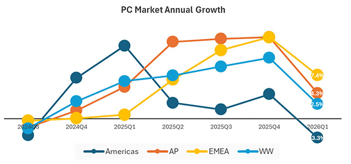 While recording positive growth in this first quarter of 2026, the component shortages and deteriorating economic conditions have started to impact the PC market, as illustrated by a sharp decline in growth trends in every region. IDC believes that the remainder of the year will see further decline in PC shipments as system prices continue to rise.