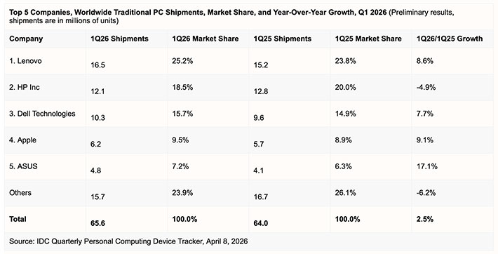 Boston, Mass. — April 8, 2026 — Global PC shipments grew 2.5% year-over-year in the first quarter of 2026, reaching 65.6 million units, according to preliminary results from the International Data Corporation (IDC) Worldwide Quarterly Personal Computing Device Tracker. Despite deteriorating macroeconomic conditions and memory shortage issues, the PC market recorded another quarter of positive growth. This growth was mostly fueled by the anticipation of rising component prices, Windows 10 migration, and new product introductions.