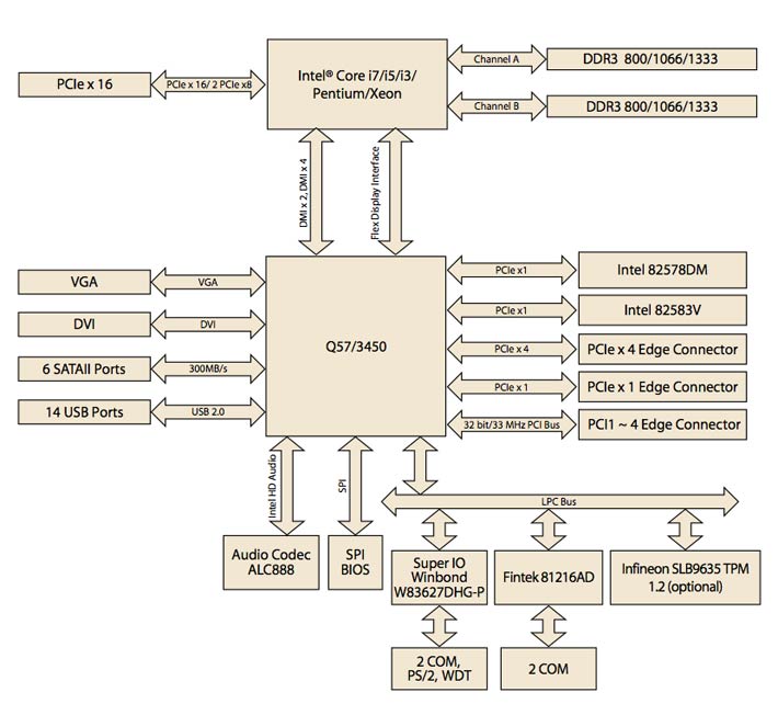 Of these, the Xeon is a heavy-duty server chip, and the various Core processors offer high performance and a variety of special Intel technologies (the i7 most, the i3 least), while the Pentium (yes, Intel is still introducing new Pentiums) represents a significantly lower cost solution. Depending on the chip, the board will come with either the Q57 or the 3450 chipset. If error-correcting ECC memory is an issue, systems with the 3450 chipset support it.