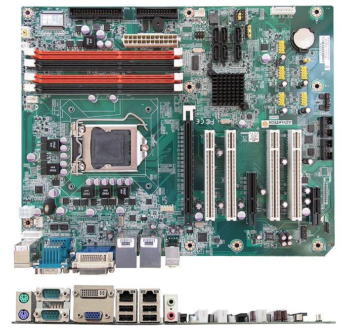 Below you can see what the bare Advantech AIMB-780 ATX motherboard looks like, both from above and looking at the external I/O block: