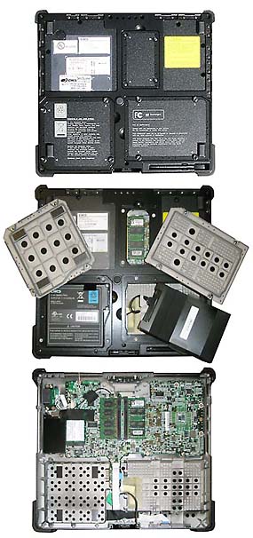 It's always interesting to see how different manufacturers achieve ruggedness. WalkAbout, of course, has many years of experience in that field and they have always impressed with their simple, no-nonsense designs that get the job done. An example is the use of rubber bumpers. It is about the most direct way to add protection. Simply screw them on and the machine is that much tougher. It's perhaps not the most elegant solution and it adds a bit to the dimensions, but it definitely makes sense. Likewise, the way the hard disk is shockmounted in its own plastic/neoprene enclosure is simple, elegant and effective.