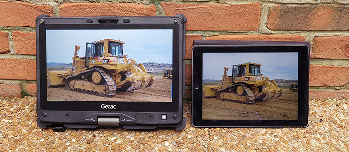 The image below pits a 2nd gen Getac V110 against the newer iPad Air 2, photographed on a bright summer morning outside our Tennessee office. What's obvious here is how the V110's 800 nits screen can generate a very good image while the Apple tablet with its roughly 400 nits screen is noticeably darker.