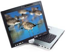 Acer then upgraded/replaced the C300 with the TravelMate C310, essentially the same machine, but one that has been equipped with more modern technology. Under the hood of the C310 is either an Intel M 740 (1.73 GHz) or M 760 (2.0 GHz). 533 DDR2 memory is now used for the dual slots inside the C310, and each can handle up to a gigabyte. There is the 915PM Express chipset and Nvidia GeForce Go 6200 graphics. The largest disk available was bumped from 80 to 100GB, and you now have a choice of a CD bruner/DVD player or a DVD-Dual drive DVD burner. The 4-in-1 reader now supports the Sony Memory Stick as well, and Bluetooth is standard. Unfrotunately, the big 14.1 inch screen still only supports 1024 x 768, not much these days, and the faster Intel chips mean rated battery life dropped from 5.5 to four hours. Size is roughly the same, though weight went up by just a bit: 6.4 versus 6.2 pounds. The price remains in the same range ($1,650 - 1,950, depending where you shop and what configuration you get).